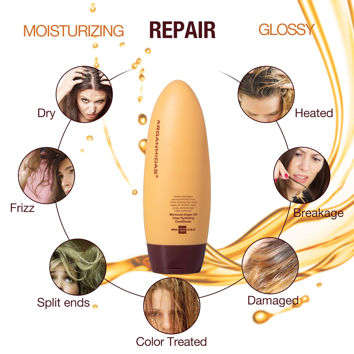 روی موهای مرطوب بمالید و به آرامی پوست سر را ماساژ دهید. در صورت لزوم بشویید و تکرار کنید. برای کسب بهترین نتیجه، با نرمکننده و مرطوبکننده روغن آرگان میداس همراه باشد.