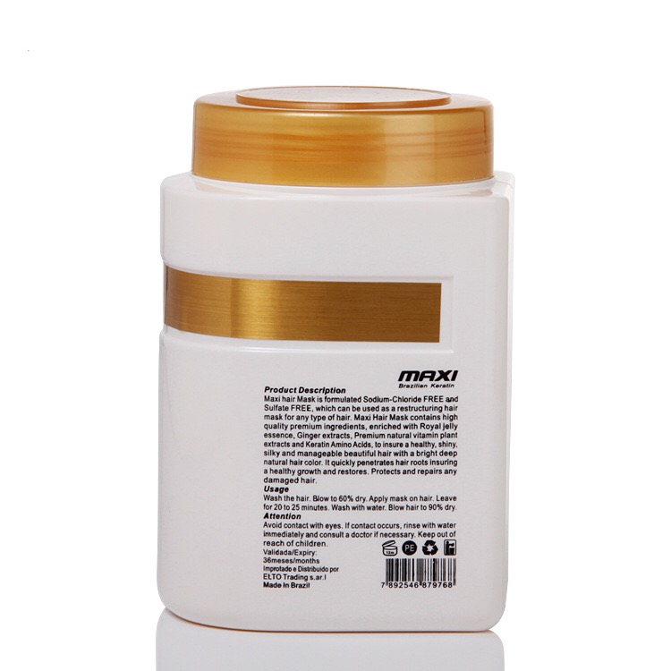 ماسک مو داخل حمام مکسی ساخت کشور برزیل دارایی کراتین،کلاژن ، ویتامین B5  و عصاره  زنجبیل بوده که به سرعت به ریشه ی موها نفوذ کرده و باعث میشود موها به سرعت تقویت و ترمیم شود و باعث رفع ریزش مو می گردد.. در  انواع مو ازجمله موهای رنگ شده و آسیب دیده قابل استفاده است. ترمیم کننده ،آبرسان حاوی بالاترین میزان مواد مغذی و پروتئینی محافظت از ساختمان مو احیا و بازسازی ساختمان مو افزایش استقامت و استحکام مو افزایش درخشندگی مو رفع خشکی مو و ضد وز فاقد سولفات و پارابن حجم :1000