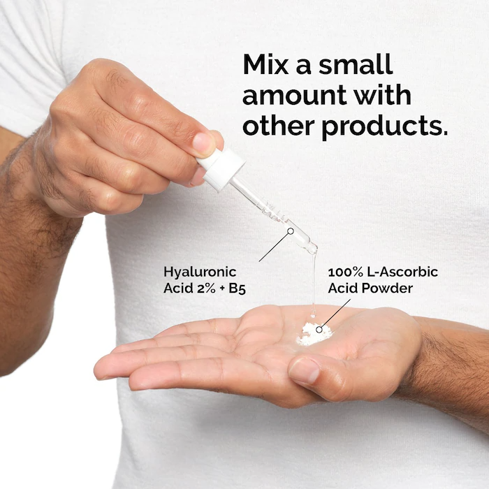 برای استفاده از پودر ال – آسکوربیک اسید اوردینری باید مقداری از آن را بر روی کف دستتان بریزید. سپس آن را با سایر محصولات مراقبت از پوست ترکیب کنید و به صورتتان بزنید.