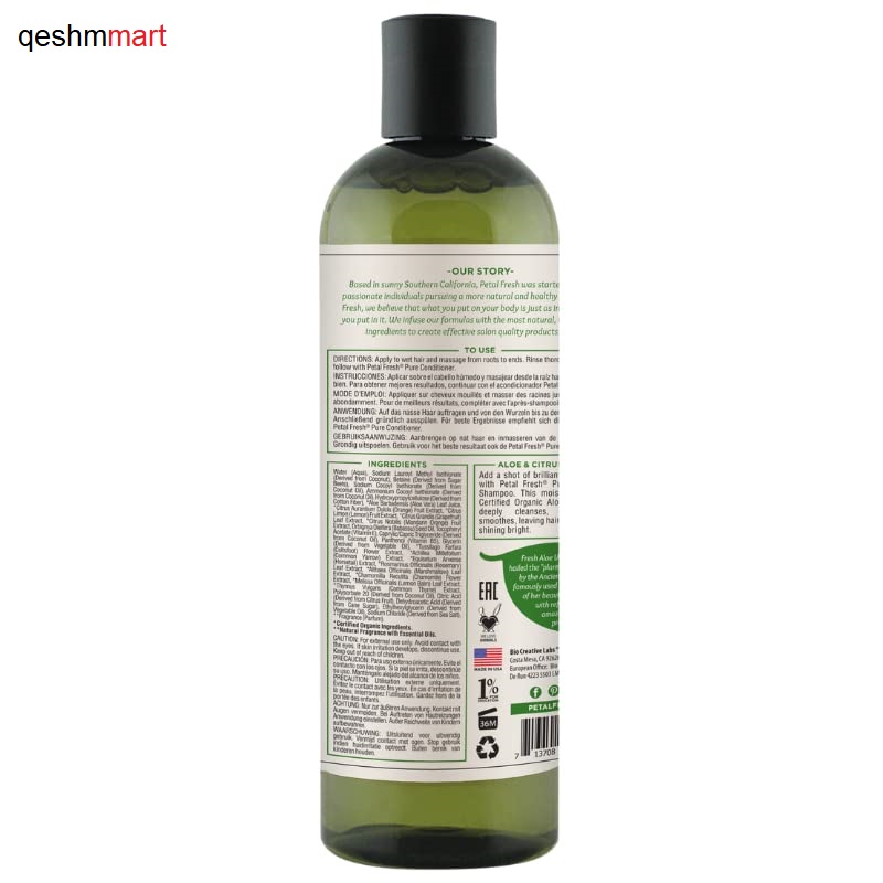 شامپو درخشان کننده آلوئه ورا و مرکبات پتال فرش Petal Fresh Ultra Shine محصولی باکیفیت و طبیعی و حاوی عصاره های گیاهی پرورش یافته به صورت ارگانیک و گواهینامه دار می باشد. شامپو آلوئه ورا و مرکبات پتال فرش ضمن رطوبت رسانی و مرطوب کنندگی، پاک کننده کامل و درخشان کننده موها می باشد. عصاره آلوئه ورای موجود در شامپوی پتال فرش باعث نرمی و درخشندگی موها می شود و مرکبات نیز سرشار از ویتامین ها از جمله ویتامین B6 جهت حفظ سلامت و درخشندگی موها می باشند.