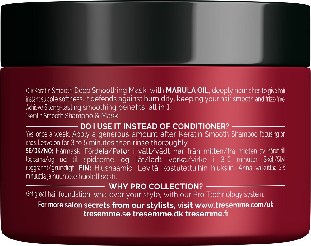 ماسک کراتینه صاف کننده موی ترزمی Tresemme Keratin Smooth دارای فرمول تغذیه کننده عمیق جهت آبرسانی مو، صاف کنندگی و کنترل وز موها می باشد. خشکی مو می تواند باعث ایجاد وز، موخوره و موهای غیرحالت پذیر معلق در هوا شود، بنابراین رطوبت رسانی فیبر مو برای داشتن موهایی صاف تر و درخشان ضروری می باشد. ماسک موی ترزمی حاوی کراتین جهت ترمیم ساختار مو و روغن مارولا جهت تغذیه عمیق موها است، این ماسک مو 5 عملکرد مهم را برای داشتن موهایی صاف به خوبی انجام می دهد که شامل: مقابله با وز مو، منظم کردن و باز کردن گره مو، درخشان کننده مو، نرم کننده مو و رفع حالت موهای معلق در هوا می باشد.