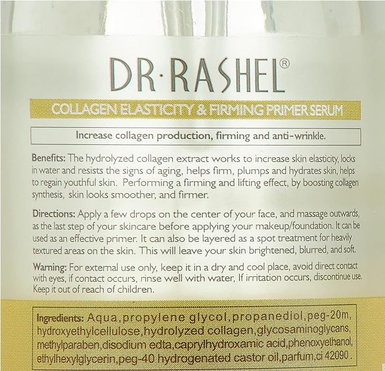 سرم و پرایمر کلاژن ساز دکتر راشل DR.rashel حاوی عصاره تجزیه شده کلاژن برای افزایش کشش پوست به کار میرود. این محصول باعث کند شدن روند پیری پوست شده و استحکام و سفتی پوست را افزایش میدهد. با کمک این سرم پوست شما سفت تر و زیباتر به نظر میرسد.