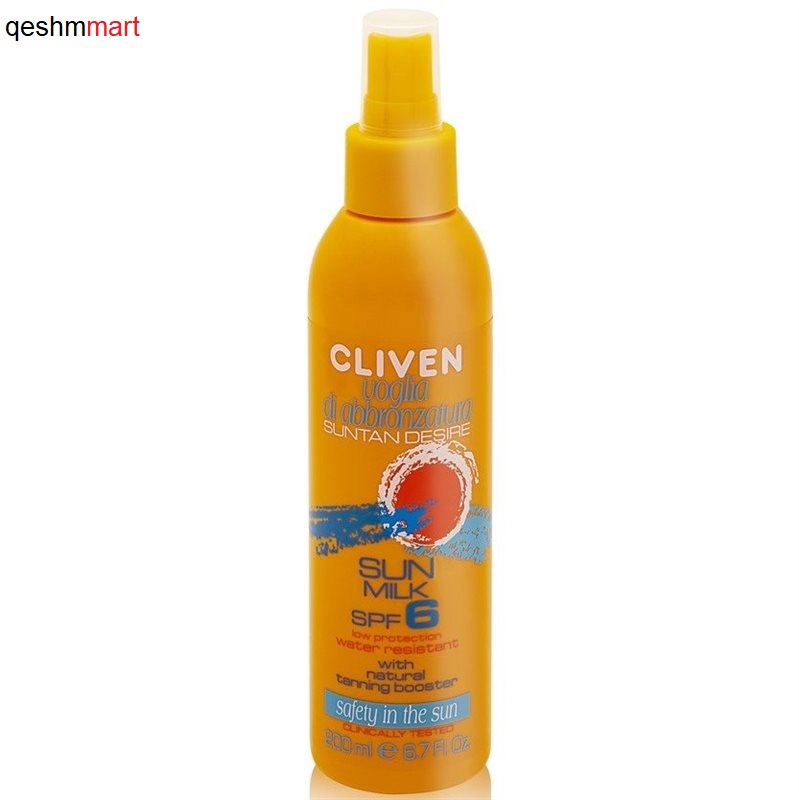 شیر برنزه کننده و ضد آفتاب بدن کلیون Cliven Sun Milk SPF6 حاوی کمپلکس مواد موثر فعال گیاهی و تایرزین برای ایجاد نمای برنزه طلایی طبیعی پوست است که همراه با فیلترهای ضدآفتاب SPF6 محافظت کننده در برابر پرتوهای UVA و UVB می باشد. شیر آفتاب کلوین همچنین دارای فرمول ضدآب و حاوی پروتئین های گیاهی و ویتامین E برای محافظت از پوست است و ضمن رطوبت رسانی از ایجاد قرمزی و آسیب ناشی از آفتاب جلوگیری می کند.