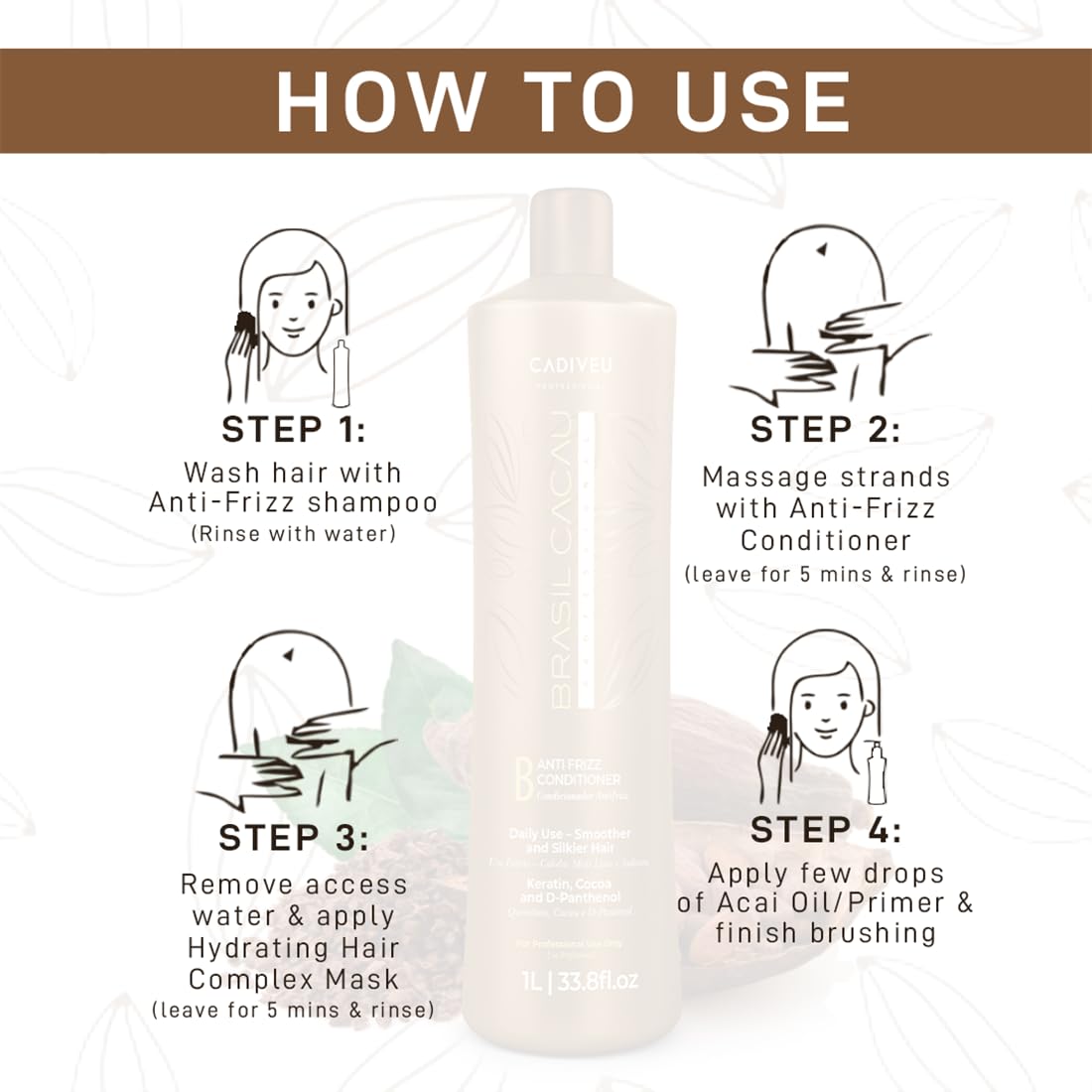 پس از پایان کار کراتین و تراپی مو و خشک شدن موها, مجدد موها را شستشو دهید و سپس آب موها را گرفته و کمی از ماسک تثبیت کراتین کادیوو بر روی موها ریخته و ماساژ دهید و 10 دقیقه مکث کنید و سپس موها را آبکشی نمایید و در آخر با باد ملایم سشوار خشک نمایید.