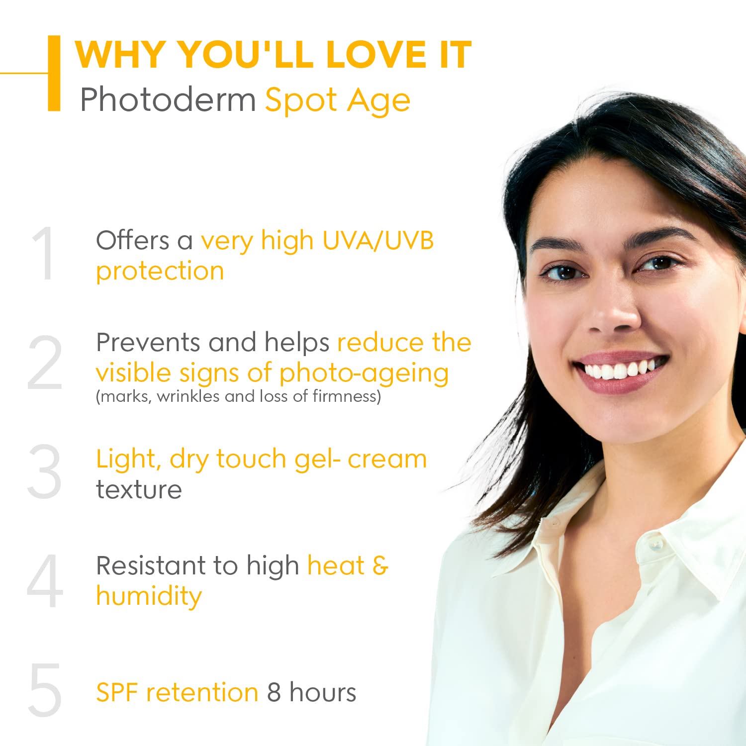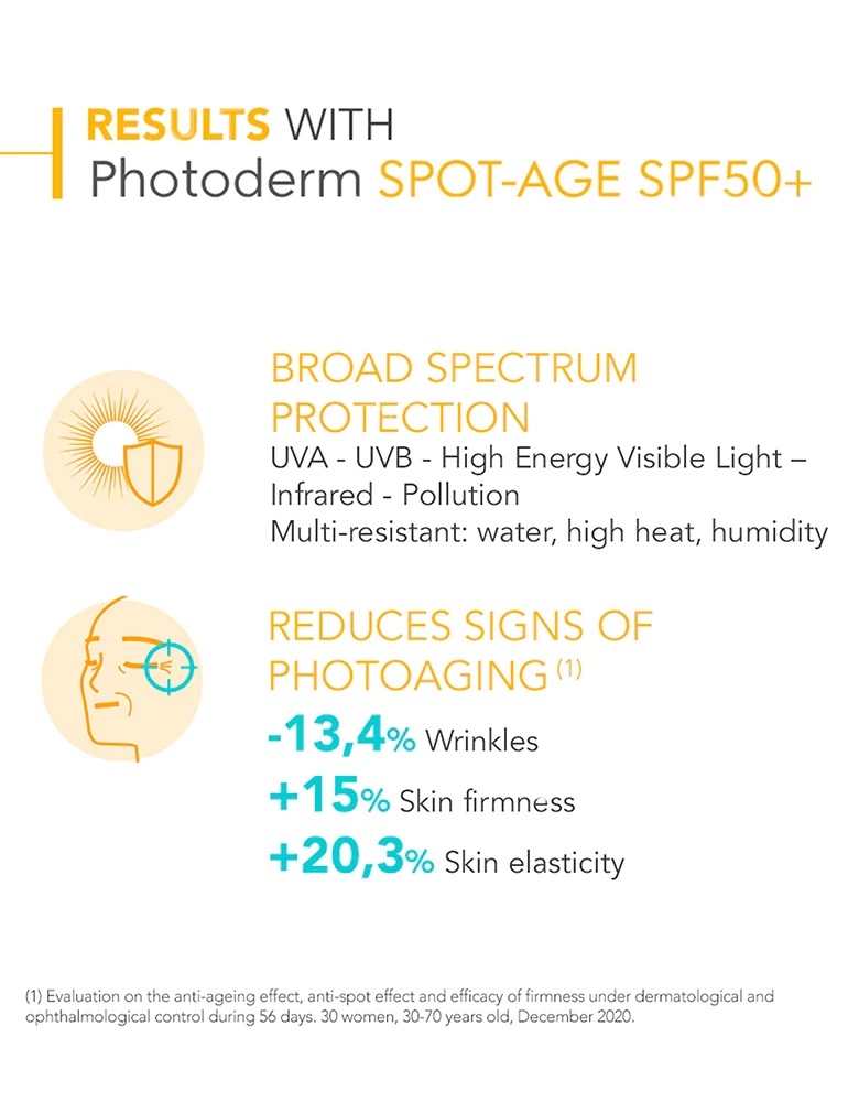 کرم ضد آفتاب و ضدلک بایودرما فتودرم اسپات ایج Photoderm Spot Age بایودرما فتودرم اسپات ایج دارای فرمول محافظت کننده پوست در برابر ایجاد لک ناشی از پرتوی آفتاب و افزایش سن و همچنین کاهش دهنده لک و اثرات پیری زودرس می باشد. کرم ضدآفتاب اسپات ایج بایودرما حاوی ترکیبی قدرتمند از سه ماده فعال ویتامین C جهت روشن کنندگی، ویتامین E جهت محافظت پوست و عصاره گیاه سنتلا آسیاتیکا با خواص ترمیم کنندگی و بازسازی پوست است و ضمن محافظت قوی و کامل ضدآفتاب، کاهش دهنده علائم پیری ناشی از پرتوی مضر آفتاب (لک، چروک و از دست دادن استحکام) است و از آن جلوگیری می کند.