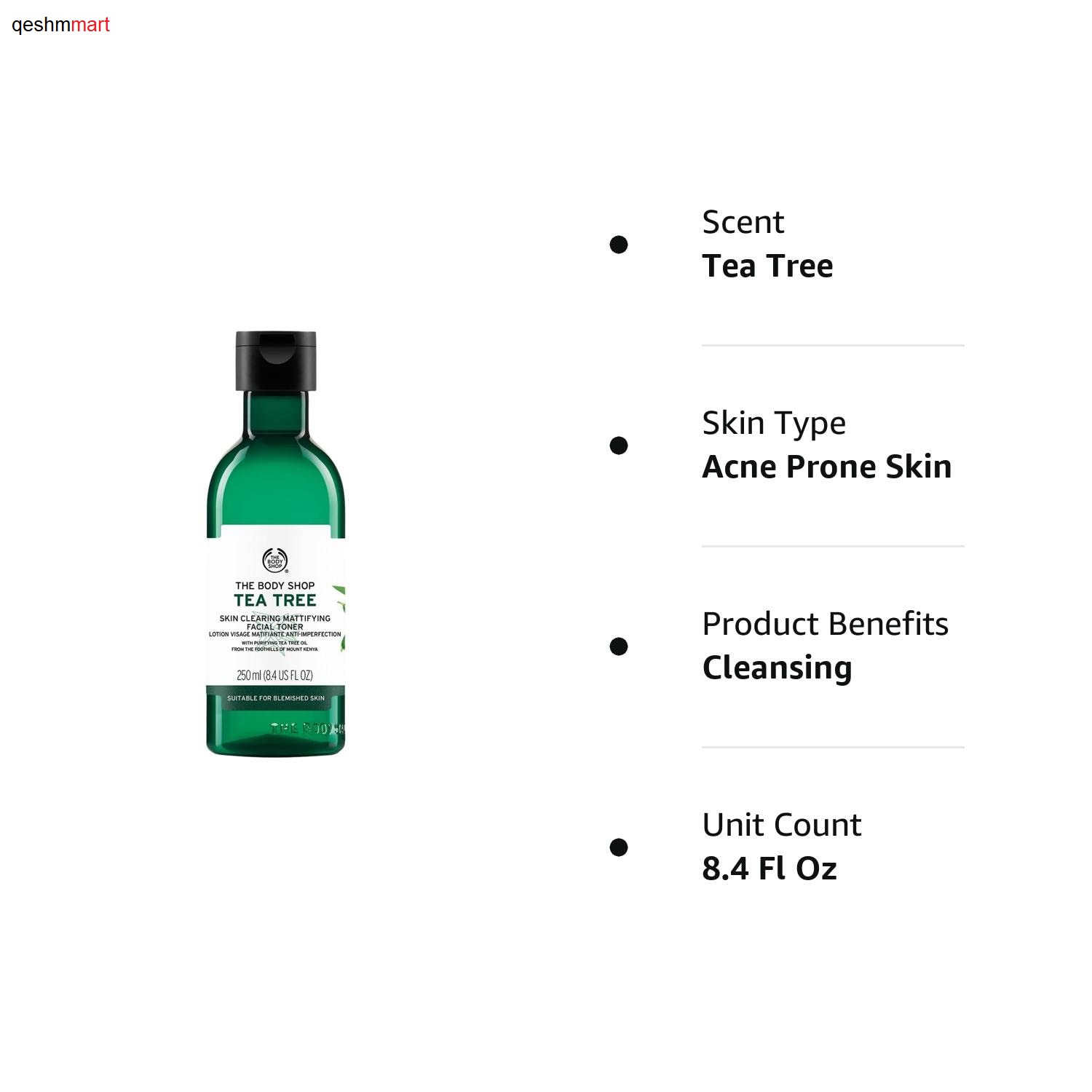 تونر تی تری بادی شاپ دارای خاصیت آنتی اکسیدان بوده و برای پاکسازی پوست های مستعد آکنه بسیار مناسب است. این محصول التهابات روی پوست را به سرعت تسکین داده و موجب نابودی سریع تر آکنه های پوستی می شود. در واقع این تونر با کیفیت قابلیت تنظیم چربی پوست داشته و به مرور زمان منافذ پوست را کاهش می دهد. شما می توانید پیش از انجام روتین پوستی خود این تونر را به صورت دورانی روی پوست صورت ماساژ دهید چرا که تاثیر استفاده از کرم های پوستی را افزایش می دهد. به دلیل خاصیت مات کنندگی چربی اضافی پوست را گرفته و براقیت پوست صورت را کاهش می دهد.