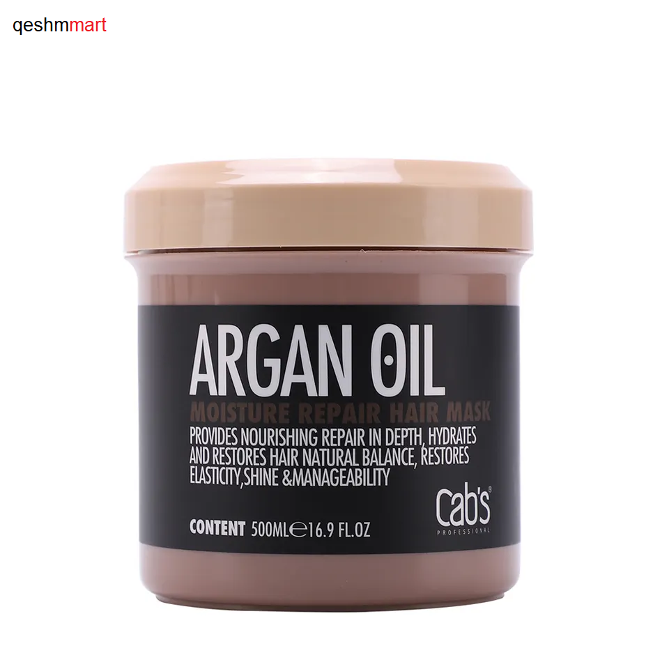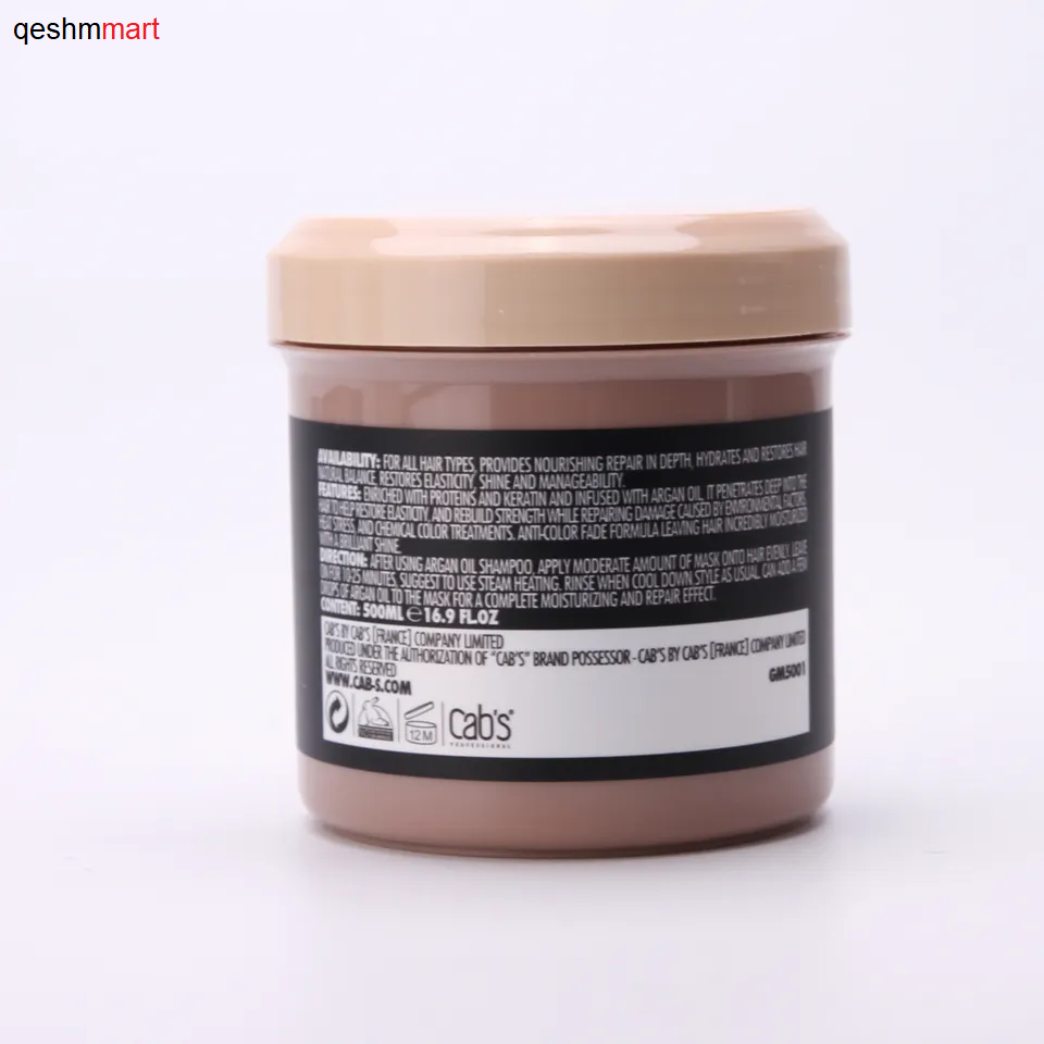 ماسک درمان مو با روغن آرگان Cabs برای موهای  آسیب دیده مناسب برای  انواع مو، ترمیم کننده عمقی مو، آبرسانی و بازیابی حالت طبیعی مو، بازیابی حالت ارتجاعی، درخشندگی و کنترل پذیری مو غنی شده با پروتئین و کراتین و تزریق شده با روغن آرگان،این محصول  به عمق مو نفوذ می کند تا به بازیابی حالت ارتجاعی، و بازسازی استحکام کمک کند و در عین حال آسیب های ناشی از عوامل محیطی، استرس گرمایی و درمان های شیمیایی رنگ را ترمیم می کند. باعث درخشندگی و رطوبت موها می شود. طریقه مصرف: 1- پس از استفاده از شامپو روغن آرگان، مقدار متوسطی از ماسک را به طور یکنواخت روی موها بمالید. 2- بگذارید 10-25 دقیقه بماند، پیشنهاد می شود از بخار استفاده کنید. 3- وقتی خنک شد آبکشی کنید، به سبک معمول می توانید چند قطره روغن آرگان را به ماسک اضافه کنید تا اثر مرطوب کنندگی و ترمیم کامل داشته باشد. حجم :500ml