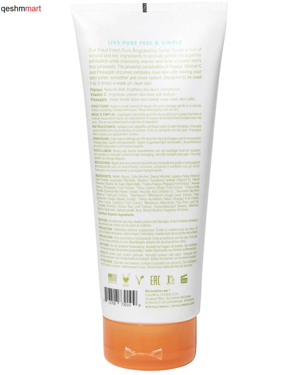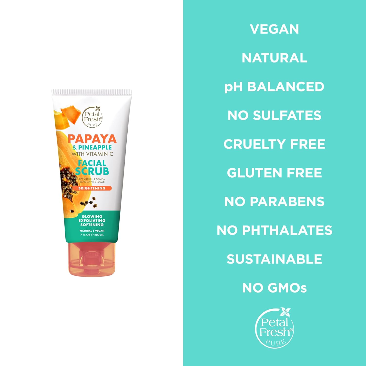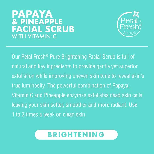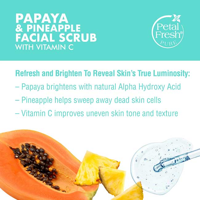 اسکراب روشن کننده صورت پاپایا و آناناس پتال فرش Petal Fresh Papaya Scrub دارای فرمول باکیفیت و حاوی عصاره های کاملا طبیعی و ارگانیک برای پاکسازی سلول های مرده و تیرگی های پوست و احیای پوستی لطیف، هموار و درخشان می باشد. اسکراب پتال فرش حاوی عصاره ارگانیک پاپایا متشکل از اسید میوه AHA برای روشن کنندگی پوست، عصاره آناناس ارگانیک متشکل از آنزیم های پاک کننده سلول های مرده پوست و ویتامین سی برای افزایش شفافیت و روشن کنندگی پوست می باشد. این فرمول همچنین بدون سولفات و مواد پاک کننده شیمیایی بوده و همراه با حفظ لطافت پوست دارای اثربخشی موثر است و پس از هر بار استفاده پوستی روشن، شفاف، لطیف و هموار خواهیم داشت.