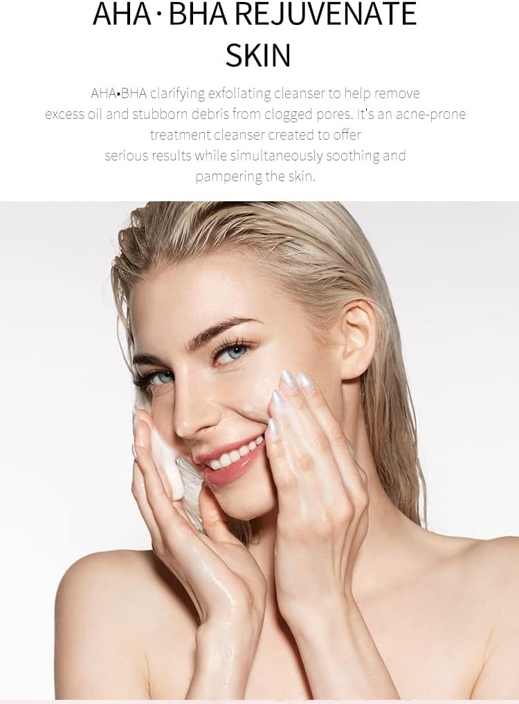پاک کننده لایه بردار شفاف کننده AHA.BHA برای کمک به از بین بردن چربی اضافی و باقی مانده های سرسخت از منافذ مسدود شده همچنین می تواند به ریختن سلول های مرده پوست برای تجدید سطح پوست کمک کند و علائم پیری را به ویژه در اثر آسیب های ناشی از نور خورشید به وضوح نرم کند. این یک پاک کننده برای درمان آکنه است که به منظور ارائه نتایج جدی و در عین حال تسکین و لطافت پوست ایجاد شده است.