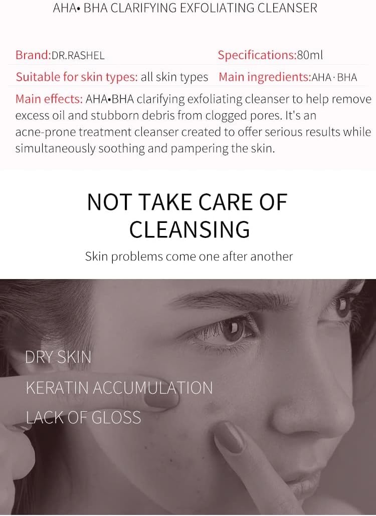 کرم پاک کننده و لایه بردار دکتر راشل مدل AHA-BHA . محصولی مناسب برای از بین بردن چربی اضافی از منافذ مسدود شده پوست است، همچنین باعث از بین رفتن سلول های مرده پوست شده و باعث شفافیت پوست می شود. علائم پیری را به ویژه در اثر آسیب های ناشی از نور خورشید به وضوح نرم می کند. این یک پاک کننده برای درمان آکنه است که به منظور ارائه نتایج جدی و در عین حال تسکین و لطافت پوست ایجاد شده است.