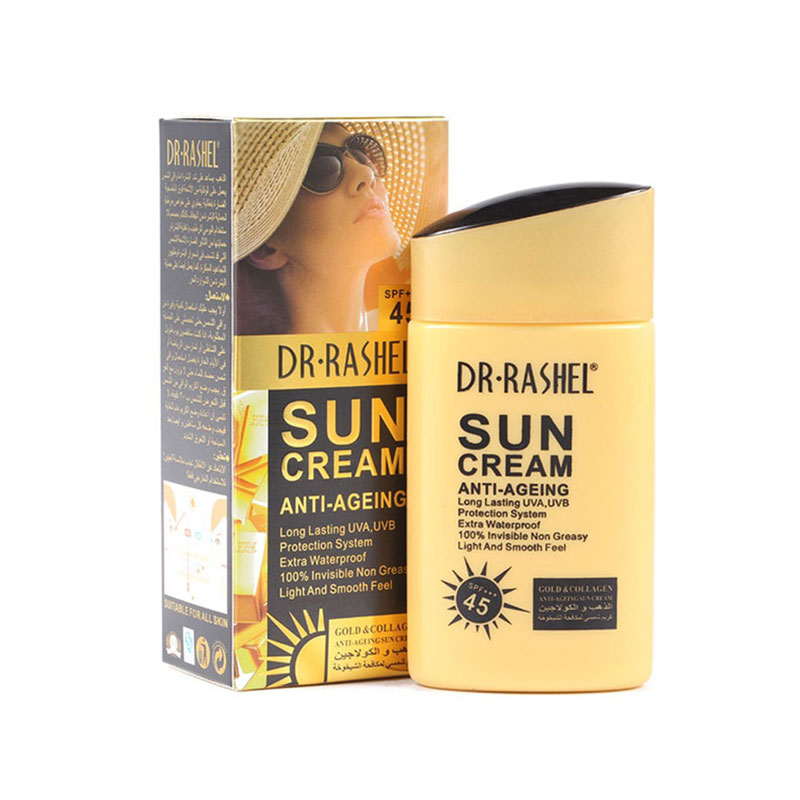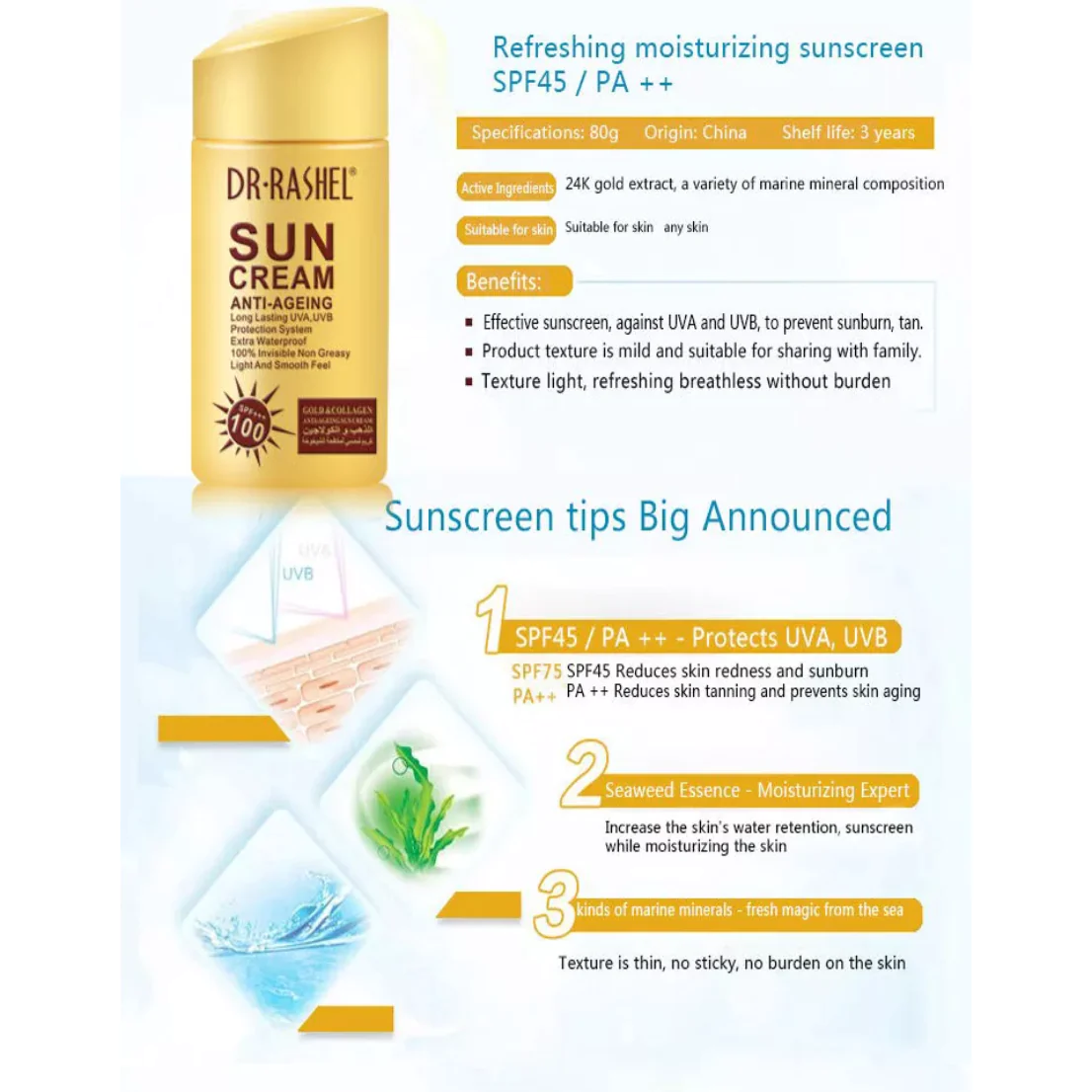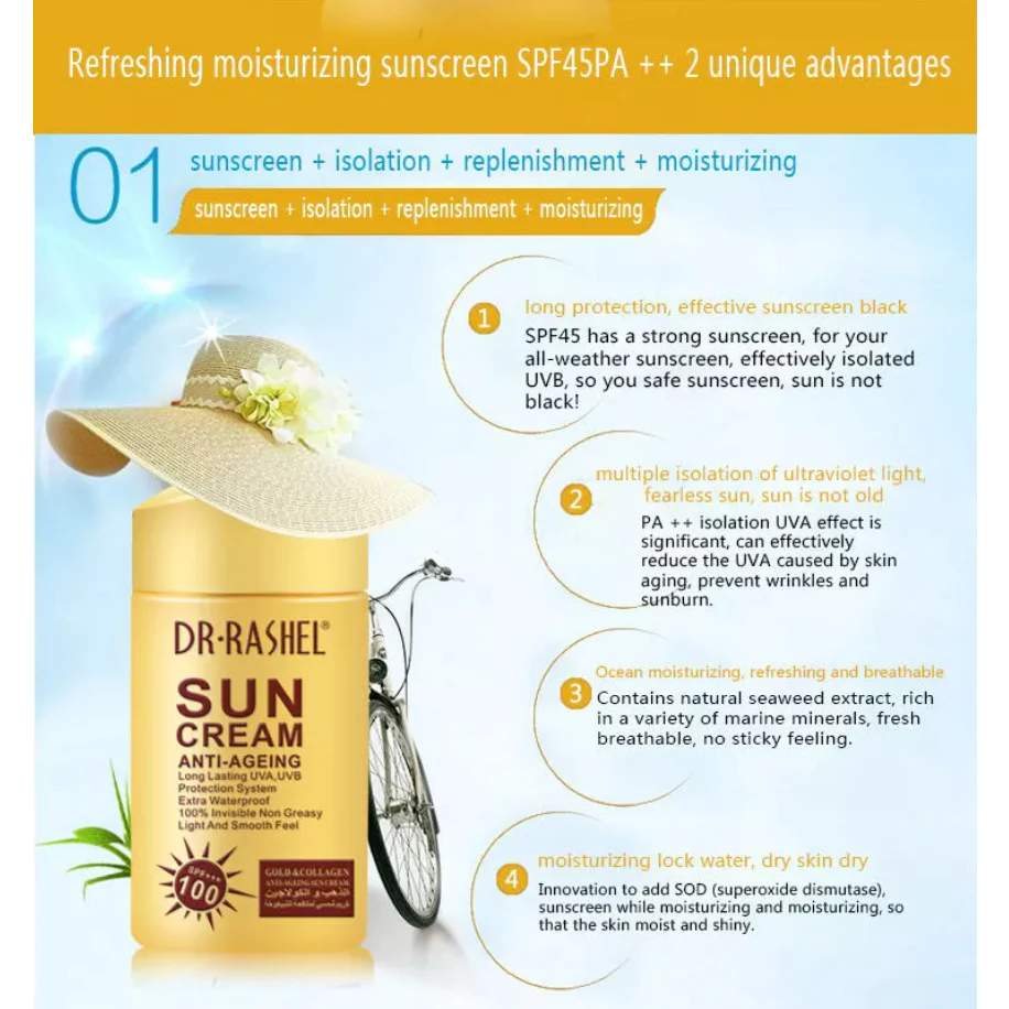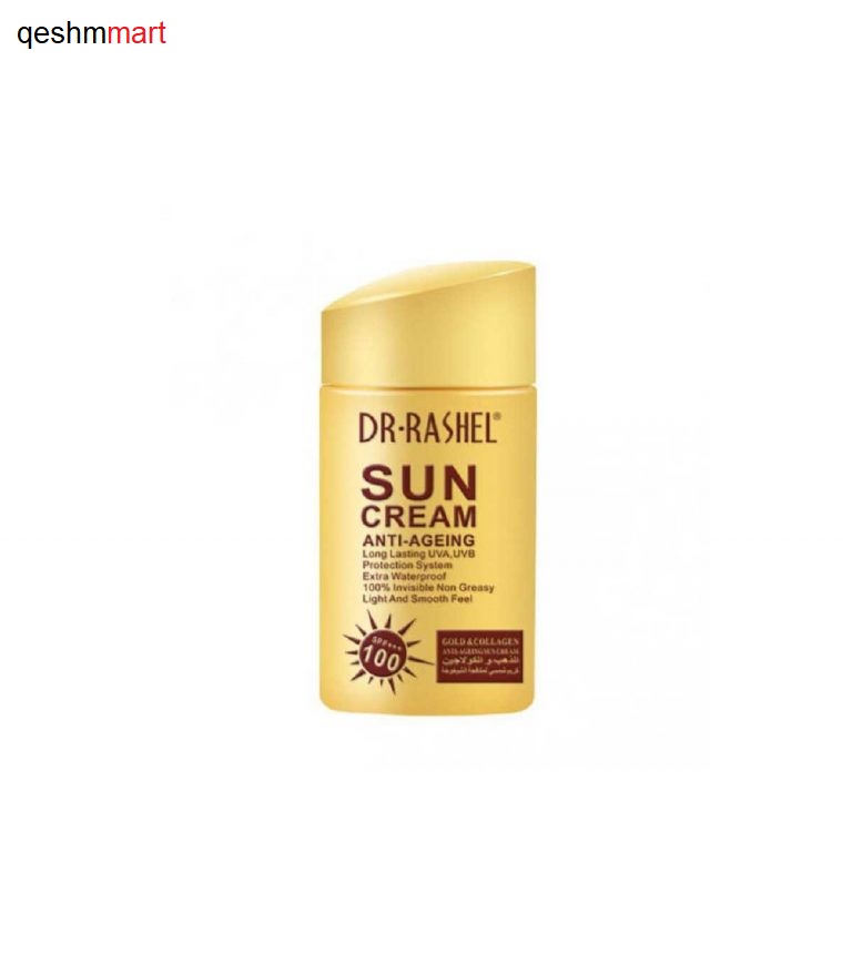 ضد آفتاب و ضد پیری دکتر راشل SPF100 غنی شده با طلا و کلاژن می باشد. این کرم ضد آفتاب یک ضد پیری قوی و محافظ کننده عالی برای پوست شما است.ضدآفتاب دکتر راشل بافت بسیار سبکی دارد که فاقد هر گونه چربی می باشد این کرم ضد آفتاب فوری جذب پوست شما میشود و اصلا روی پوست شما سنگینی نمی کند.