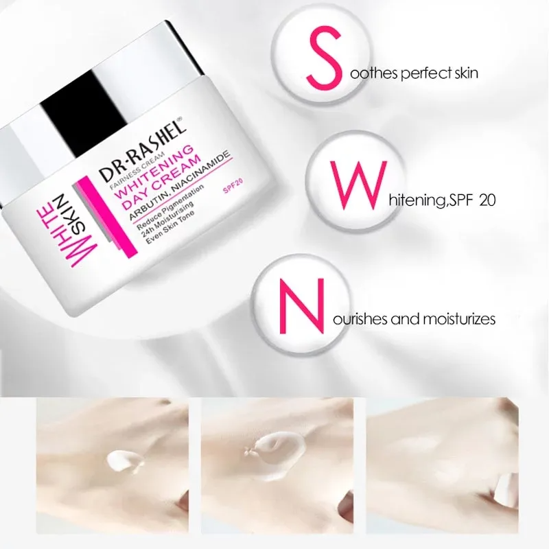 کرم روز سفید کننده پوست دکتر راشل Dr.Rashel شامل مواد آربوتین و نیاسینامید است که به طور پزشکی آزمایش شده و ثابت شده است که باعث یکدست شدن رنگ پوست می شود ، لکه های تیره را کاهش می دهد و باعث تغییر رنگ رنگدانه ها می شود. مواد فعال طبیعی موجود در کرم روز سفید کننده دکترراشل شفافیت پوست را احیا کرده و سلول های تازه پوست را تغذیه، رطوب رسانی و آبرسانی عمیق می کنند.