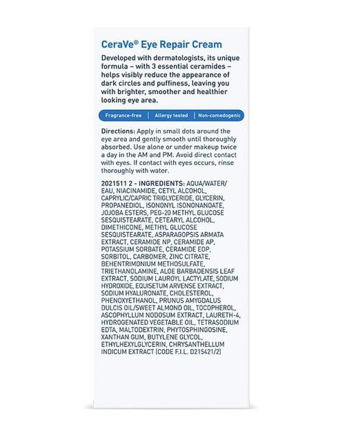کرم دورچشم سراوی یک کرم دورچشم شناخته شده در میان متخصصان پوست سراسر دنیا می باشد. ویژگی ترمیم کنندگی این دورچشم آن را به یکی از بهترین دورچشم های مراقبتی تبدیل کرده است. فرمول این محصول حاوی سه سرامید ضروری برای تجدید حیات سلولی و حفظ سد دفاعی پوست اطراف چشم می باشد. اسید هیالورونیک موجود در این دورچشم باعث آبرسانی عمقی پوست اطراف چشم می شود. حلقه های تیره و پف دورچشم بعد از استفاده از این محصول کاهش محسوسی پیدا خواهند کرد.