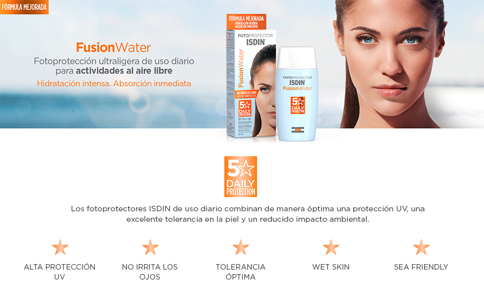 این کرم به دلیل برخورداری از تکنولوژی های Fusion (جذب سریع)، Safe-Eye (قابل استفاده اطراف چشم)، Wet-Skin (قابل استفاده روی پوست مرطوب) و Thixotropic (رقیق شدن در اثر گرما) جز بهترین کرم های ضد آفتاب حال حاضر دنیا محسوب میشود. فرمولاسیون این ضد آفتاب بر پایه آب بوده و همین باعث شده تا افرادی که پوست چرب دارند نیز با خیال راحت این کرم را در روتین روزانه پوست چرب خود قرار دهند. کرم فیوژن واتر دارای رنگ بژ طبیعی و جذب بالا بوده و هیچ گونه چربی و براقی روی پوست باقی نمیگذارد. باتوجه به رنگی بودن این کرم میتوان از آن به عنوان کانسیلر یا کرم آرایشی نیز استفاده کرد.