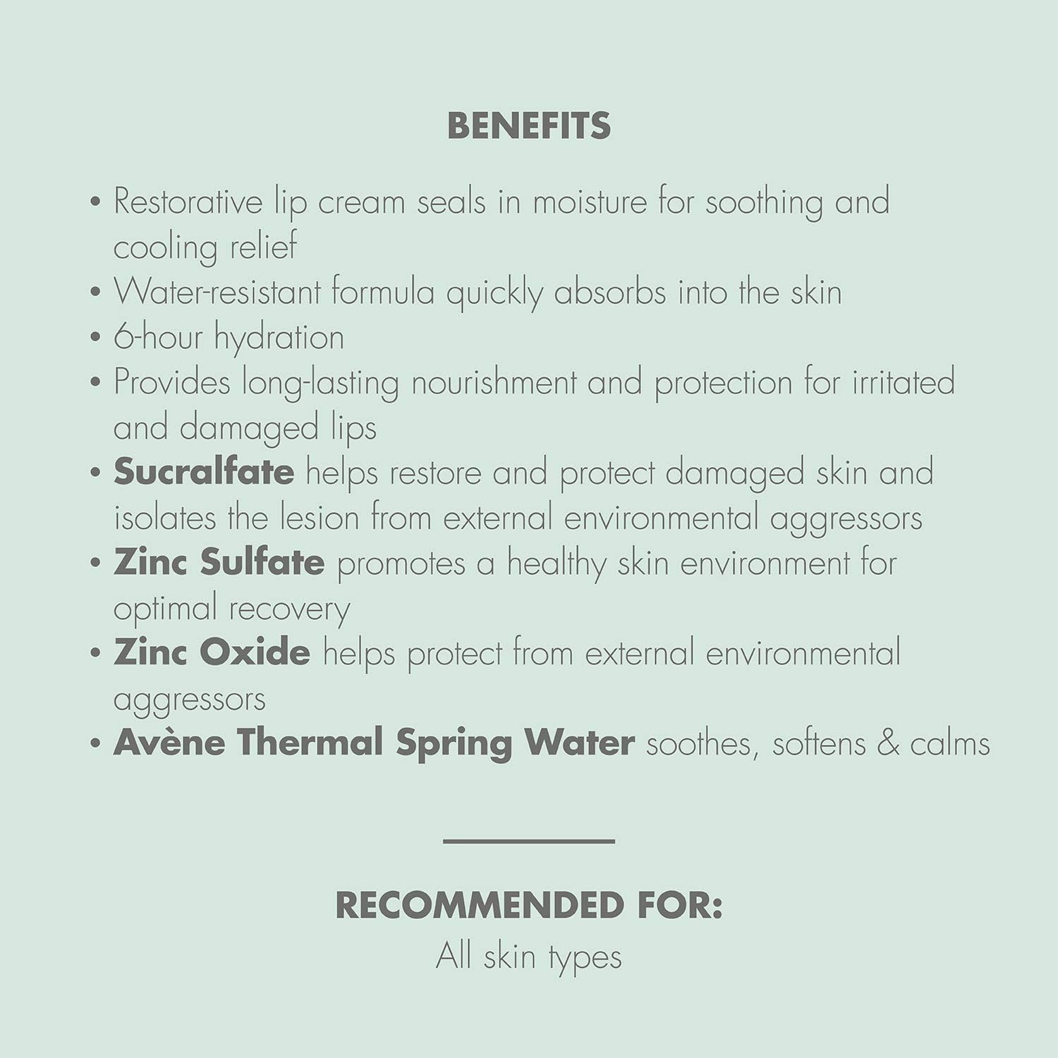 حاوی سوکرالفیت می باشد که ترمیم لایه اپیدرم پوست را تسهیل می کند و از پوست لب را از آسیب های خارجی محافظت می کند.