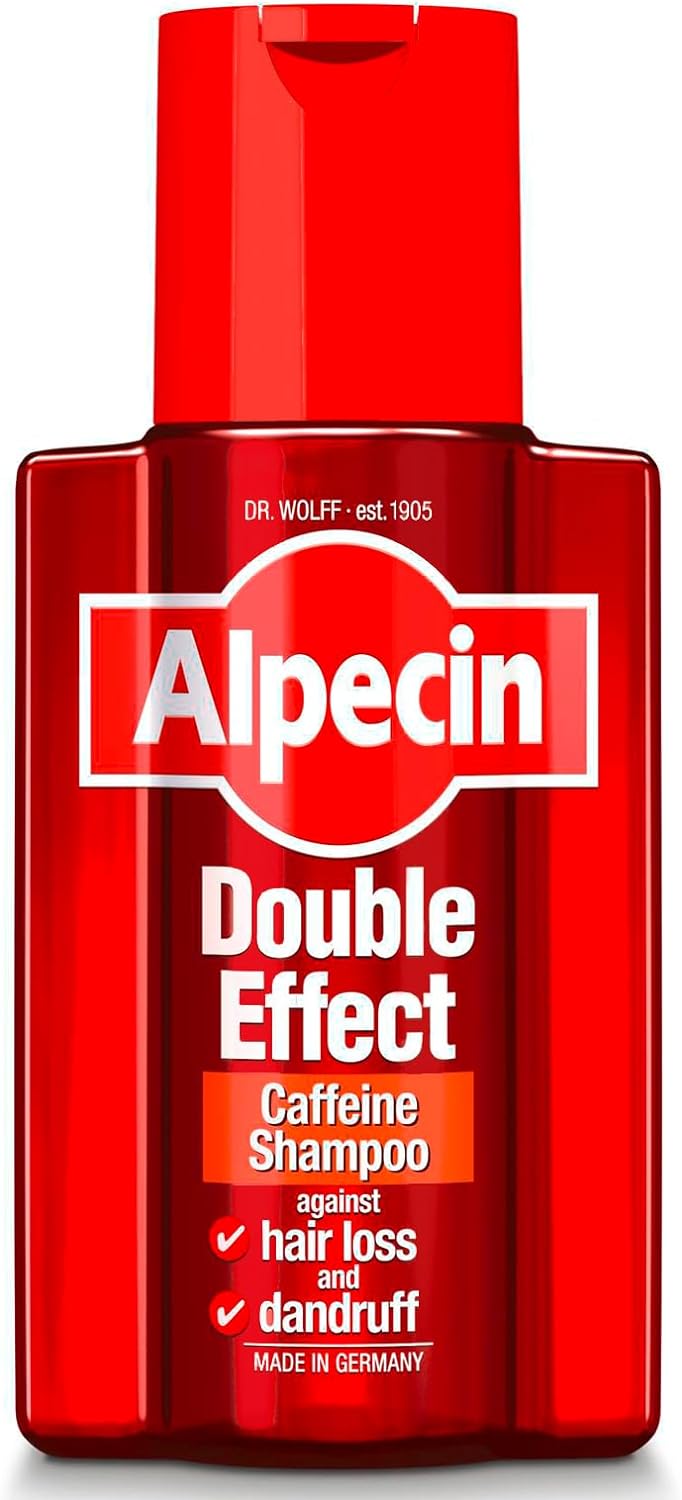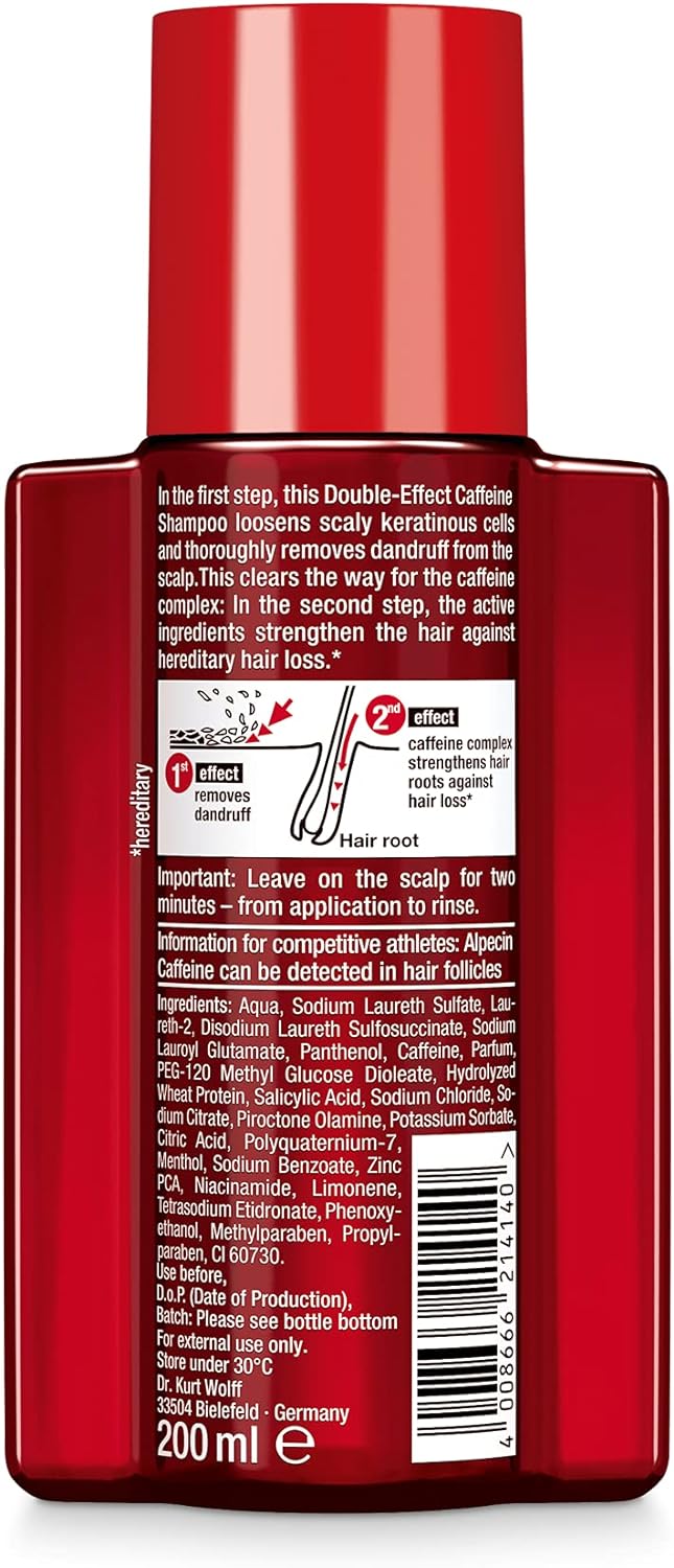 شامپو ضدریزش و ضدشوره کافئین آلپسین Alpecin Doppel Effekt دارای فرمول پیشرفته توسعه یافته در آزمایشگاه دکتر ولف با عملکرد دوگانه ضدریزش و ضدشوره و مناسب برای تقویت موهای ضعیف و نازک، کاهش ریزش مو، کاهش شوره و تسکین خارش پوست سر می باشد. شامپو کافئین آلپسین دارای ترکیب انحصاری ثبت شده جهت فعالسازی فرایند رشد مو است، این فرایند همراه با افزایش ضخامت و استحکام موها همراه است. این فرمول همچنین حاوی سالیسیلیک اسید و پیروکتون اولامین به عنوان مواد موثر ضدشوره و تسکین دهنده پوست سر می باشد. شامپو کافئین آلپسین پس از سال ها تحقیق بر روی الگوی رشد مو، موثرترین و دقیق ترین فرمول و دوز مواد تشکیل دهنده را جهت جلوگیری از ریزش و افزایش ضخامت موها در خود جای داده است. این ترکیب علاوه کافئین جهت تقویت و انرژی بخشی مو، حاوی پنتنول (پرو ویتامین B5)، نیاسین آمید (پرو ویتامین B3)، پروتئین هیدرولیز شده گندم و نعناع جهت تقویت ریشه مو و تسکین پوست سر می باشد.