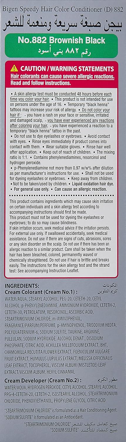 رنگ موی بیگن اسپیدی Bigen Speedy دارای فرمول نوآورانه جهت رنگ کردن آسان و سریع موهای سفید می باشد. رنگ موی بیگن حاوی عصاره های طبیعی از جمله نعناع، رازیانه، رازک، بومادران و بابونه جهت نفوذ عمیق در ساقه مو است.