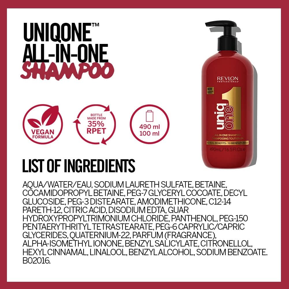 شامپو ترمیم کننده 10 کاره رولون یونیک وان Revlon Uniq One محصولی فوق العاده از برند رولون و دارای فرمول تقویت شده و 10 ویژگی منحصر به فرد برای ترمیم، مراقبت و محافظت چندگانه از موها می باشد. این ویژگی ها بدین صورت می باشد: